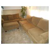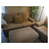 Living room furniture including fabric couch, matching loveseat & ottoman, end tables, coffee table