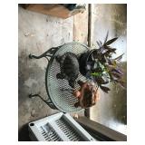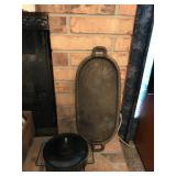 trim, white iron upholstered vanity chair, vintage cast iron griddle w/rolled edges, cast