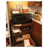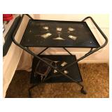 iron skillets, very retro rolling bar cart, captain’s chair style bar stools, toaster oven,