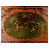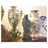 Spanish revival dining set with chairs by J. Saurez, fabulously carved Mid Century console cabinets, antique all tree / bench with excellent proportion, up-cycled parlor furnishings with contemporary upholstery including sofas and chairs, marble and figural table lamps. Incredibly inlaid side chairs, charming pair of French marquetry cabinets with marble tops, graduated mahogany étagère, Provincial collector’s case with hand painted detail, Pair of John Widdicomb Mandarin side tables, beautifully inlaid Chinese screen and panels, Japanese china, Victorian era bedroom furnishings and lovely ladies writing desk, statuary, several period bronzes and paintings of merit including a classical Moreau and