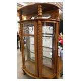 BEAUTIFUL ELEGANT AND POSSIBLY MID-CENTURY BOW FRONT WOOD AND GLASS CURIO CABINET. MADE FROM SOLID WOOD AND HAS A POSSIBLE LEADED CLEAR CUT GLASS PANEL SET IN TOP OF THE DOOR, BEAUTIFUL CARVED TOP TRIM PIECE, OVAL INSET ACCENT MIRROR, 3 GLASS SHELVES AND BOW FRONT, INTERIOR LIGHT THAT WORKS. CAN LOCK; HOWEVER, DOES NOT COME WITH A KEY. IN EXCEPTIONAL CONDITION. MEASURES 48" WIDE x 18.5" DEEP x 80" TALL. THIS CABINET IS BEAUTIFUL AND WELL MADE. AS IT IS QUITE HEAVY, PLEASE MAKE SURE TO BRING ENOUGH HELP TO MOVE AND LOAD THIS PIECE. PLEASE SEE PHOTOS FOR DETAIL THERE IS A RESERVE ON THIS ITEM