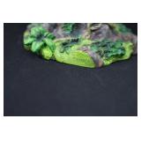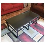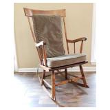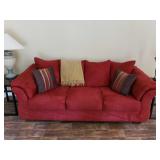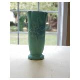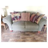 8 Ashley Furniture Sofa 9 Van Briggle Vase #84 Marked with Van Briggle's double-A logo, "Van Briggle Colo. Spgs” and finishers mark. D: 8.5" H x 4" w at the opening 10 Craftsman style lamp with yellow and orange tented shade. 11 vintage Nichols and Stone Rocking Chair 12 Ashley Brown loveseat tw: 66"W x 35" H x 36" D 13 Metal and Black Tempered Glass Coffee Table