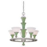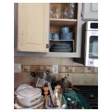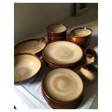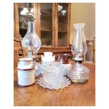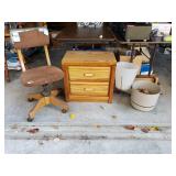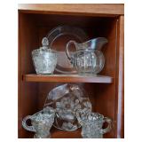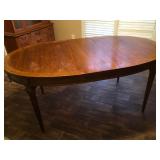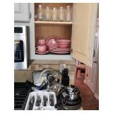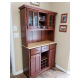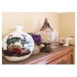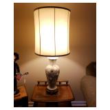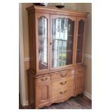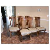 95 Six Vintage Dining room Chairs with Mid-century flair 1 arm chair plus 5 side chairs 96 Vintage Dining table with 2 leaves 97 Vintage Americana China Hutch with Glass front display cabinet over base with drawer and storage area. 98 Heavy fine pottery lamp with shade 99 Kitchen Step Back Hutch,
