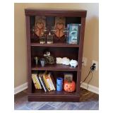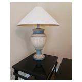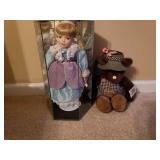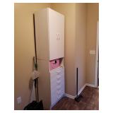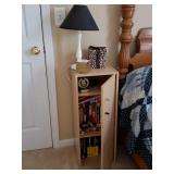 169 White storage cabinet. Does not include the contents 170 Doll in glass case and Gund Teddy Bear 171 Vintage lamp with shade Floral applique 172