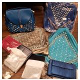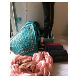 35 Stylish lot of new accessories including 1 pair knee high black embellished vinyl boots, a large blue tote/purse, 3 small wallet purses with optional chain strap, 2 Festivity flat scarves, a pair of red and white round scarves, and 2 Pink Pewter collection sparkly hair pins. 36 Fashionable lot including a pair of size 7 Festivity Knee high black leather boots, a triangle shaped teal blue embellished back pack style purse, 3 wallet/purses with optional chain strap, 2 round scarves and a set of 2 embellished hair pins. 37 Baumanometer Standby Model - Blood Pressure Machine With cuff. On wheels. 38 Group of new Fashion bags Including Beautiful chic blue studded handbag fold over latching with strap, over the shoulder studded bags in Grey and Blue, evening bags/ clutches-with optional chain shoulder strap in a variety of colors, All new- taken out of the plastic to photo only. 39 Vintage Pioneer SX-2300 stereo reciever with a Magnavox Disk Player. Powers on. Seller states was working when last used. 40 925 Cubic Zirconia Ring