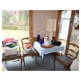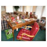 Fine Home Furnishings: Sherrill leather sectional, Sherrill upholstered chairs, La-Z-Boy recliner, upholstered chairs, pine coffee table, Victorian tiger maple stand, Victorian caned seated chairs, Victorian slant top desk, Victorian chest with mirror, painted nesting tables, Kling dresser w/ mirror and chest of drawers, French style writing desk, corner curio, curio side table, painted accent console table, one-drawer stands, wing chairs, including England and Key City, pine chest of drawers, 3-panel woven screen, Butlers coffee table, side tables, lamps incl. Maitland Smith, Baldwin and Stiffel, stained glass “balloon” lamps, floor lamps, oil lamp, dictionary stand, Seth Thomas mantle clock, oak hall tree, oak storage bench, French Provincial dining room set incl. table with two leaves, 8 chairs and buffet, Crescent dining room set, including table with two leaves, six chairs, pads and sideboard, butcher block table with chairs, salad bowl set on stand, Century leather office chair with nail heads, Fairfield office chair, office chairs, desks, bookcases, book shelves, filing cabinets, twin beds with headboard, box springs and mattresses, twin beds, antique dresser, dresser with mirror, plant stand, artist easel/stand, Golden electric lift chair, pool table, Foosball table, Air Hockey table, Kenmore stackable washer /electric dryer, Weber propane grill, Curtis Jere bronze skier statue, figurines, including Lladro, Hummel, Willow tree, Bunnykins, Wedgwood, Peter Rabbit and Beatrix Potter; stemware crystal incl. Orrefors and Baccarat, collection of miniature enamel boxes incl. Halycon Days Enamels, art glass, pottery incl. van Briggle, vintage oboe w/ case, autographed items incl. soccer ball, footballs, baseballs, hats and photos incl. Mary Tyler Moore scripts, Denzel Washington, Robert Redford, Mr. Rodgers, Joe Montana and Mohammed Ali, antique Viewmaster w/ cards, microscopes, antique high chairs, quilts, florals, candles, mirrors, picture frames, Longaberger baskets, kitchen items, office supplies, HP printer, organizers, Sony stereo, name brand men’s clothing incl. Hermes ties, name brand women’s clothing incl. Talbots, Lauren and Coldwater Creek, marbles, opera glasses, luggage, games, Christmas tree and Christmas decorations, storage containers, storage bins, dolls, including MadamAlexander and American Girl, Abdominizer, Tony Little Gazelle exerciser, tools, Craftsman tool storage boxes, Warner ladder, sports equipment, bike rack, Little Tikes basketball hoop, baseball and football cards, stuffed animals, linens, bird cage, huge collection of books, including antique, coffee table and cookbooks, DVD’s, CD’s, LP’s, electronics incl. Sony DC changer and digital audio/visual control center, chandelier, electric guitar, domed top trunk, golf clubs, garden tools and pots, microscopes, new twin rollaway bed and so many other treasures!