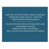 Cash only at the fine jewelry cases. Cash and Credit/Debit cards are accepted. The credit cards accepted are MasterCard, Visa, and Discover. We do not accept American Express. To all Dealers: Please bring a copy of your Tax Exempt License for us to keep and you will need to fill out a AZ5000A Tax Form for us if you would like to be tax free at our sales. Thanks for your understanding. Please Note: You Must Show Receipt At The Door If You Buy Items At The Sale. All merchandise is sold "As is", "Where is" with no Warranties, Expressed or Implied. No refunds, returns, exchanges or merchandise guarantees. All sales are final. By state law, sales tax will be added to all sales unless a copy of your current resale certificate is provided. Old licenses will not be accepted as they must be for the current year to be valid. Please respect the home and the property. Be courteous to those shopping around you. Enter at your own risk. Watch your surroundings, we are not responsible for accidents and injuries. Large bags, large boxes, backpacks, strollers, and large purses will not be allowed into the sale. Please plan accordingly. Please Note: There are no Pre-sales or early entry unless otherwise stated in the description. Please bring help to load large items, there are not movers on sight nor do we have packing materials available for fragile items. Thank You for your understanding. We sincerely appreciate it and welcome your patronage. |