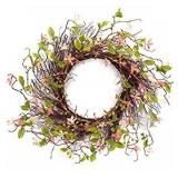 Melrose International Twig Wreath with Pink Wild Flowers, 28" . This wreath has a natural twig base accented with just a touch of greenery and wild pink tone flowers throughout giving it a natural woodland feeling. All stem on this wreath is wired and it will require some basic shaping to full size upon arrival. NEW in retail packaging. Please Preview. Retail $23.03 |