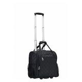 Rockland Wheeled Underseat Carry-On, Black. Carry all your essentials in style and comfort with the Rockland wheeled under seat carryon bag. Quilted polyester fabric exterior features a large main compartment for clothes, shoes and also has 2 slip pockets and two zippered pockets for keeping small essentials handy and organized. Retractable handle stores away while hand held handles allow for quickly grabbing bag from overhead bin or underneath seat. Back side has a strap allowing you to attach it to your wheeled carry on piece. This makes the perfect bag for overnight trips and the small size fits under near most airline seats allowing you to carry on your bag even when overhead bins are full. Measures 15 inch x 4 inch x 9 inch In excellent condition in opened retail packaging. Please Preview. Retail $53.97 |