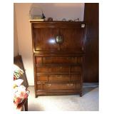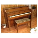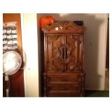 This online auction features a vintage fruitwood armoire and other furniture, Barcalounger, bar trays and coasters, wall mirrors, beer steins, four faux florals, upright piano and bench, Bassett dresser, baskets, gold and sterling jewelry, oval coffee table, area rug, demilune table, assorted coats, lamps, vintage Lenox china, cut glass stemware, wooden glass front china cabinet, wooden crane back dining chairs, century couch, storage headboard, exercise equipment and much more!