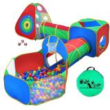 5pc Kids Ball Pit Tents and Tunnels, Toddler Jungle Gym Play Tent with Play Crawl Tunnel Toy, for Boys babies infants Children, w/ Basketball Hoop, Indoor & Outdoor, Dart Wall Game w/ 3 Dart Balls LOADS OF FUN: This bright and vibrant ball pit playhouse obstacle course playset will keep your children entertained for hours! Super cool DART WALL (3 velcro balls included) takes the FUN to a `whole new level, and is enjoyable for the kids and parents alike! Kids can customize the many different combination maze options, keeping this play set fun and exciting! A must for the active child, cats and dogs! We recommend 400 or 600 balls depending on the ball size ***BALL PIT BALLS NOT INCLUDED*** EASY ASSEMBLY AND STORAGE: The entire play jungle gym pops up and open in seconds! Tunnels fasten closed with frustration-free easy-locks. Teepee, Cube & Ball house play cave bend and fold away for convenient storage in the included lightweight carry case. Stows away compactly so it'll be out of your way, and a activity toy to take along to Grandma's house! ULTRA DURABLE AND LIGHT WEIGHT: Made with highest quality 190T soft polyester fabric and thick steel wiring, assuring your kids the ultimate SAFE, LONG LASTING, and ENJOYABLE play ground experience for hours of play! Passes or exceeds all CPSC toy safety standards. Avoid using this playpen on course surfaces like concrete or Pavement.New! In retail package. MSRP: $56.95 <41> |