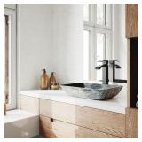 VIGO Rectangular Titanium Glass Vessel Bathroom Sink Set With Duris Vessel Faucet In Matte Black. With an organic pattern of black, white and silver streaks, the VIGO Rectangular Titanium Glass Vessel Bathroom Sink makes a spacious, eye-catching addition in any modern bathroom. This handcrafted sink resists staining and scratching over time thanks to its durable solid tempered glass construction. Includes VIGO Duris Vessel Bathroom Faucet in matte black finish, matching finish pop-up drain and optional mounting ring. This item is NEW!! In factory box.