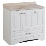 Features: • 36 in. W x 18 in. D provides ample storage in the bathroom. • Vanity top is resistant to bacteria, mold and mildew to give you a cleaner bathroom. • 36 in. W vanity top is designed with an offset left basin for added counter top space. • Brilliant white finish gives your bathroom a warm and inviting look. • Vanity includes a decorative toe kick for additional beauty. • Coordinating wall mirror, over john cabinet, back splash and side splash sold separately. • Includes 6-way adjustable European concealed hinges for easy door alignment. • Pre-assembled and ready to install. • Single basin This item is NEW!! In factory box.