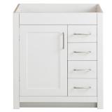 Home Decorators Collection Westcourt 30 in. W x 21.69 in. D x 34.25 in. H Bath Vanity Cabinet Only in White. Capture the attention of any guest that enters your home with the modern Home Decorators Collection 30 in. Westcourt vanity cabinet in White. Finished with a shaker style door and 4 right hand flat panel drawers, the Westcourt vanity has everything you need to store your bath needs and maintain a contemporary mood. The Westcourt vanity is finished with an clean White finish and stylish satin nickel hardware giving you that pulled together, overall look of sophistication. This item is NEW!! In factory box. Box is in fairly good condition!! BRAND NEW!!