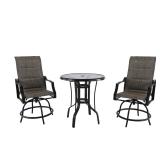 Hampton Bay Statesville 3-Piece Steel Outdoor Bistro Set. Create a cozy and elegant dining space with the Statesville 3-Piece Steel Dining Set. Durable steel frames are powder-coated for protection. The set includes 2 swivel motion chairs and a bistro table with a glass top, perfect for entertaining.