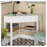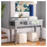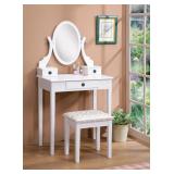 Moniya White Wood Vanity Table and Stool Set.This stylish contemporary vanity table comes with swivel adjustable mirror and 3 storage drawers. It's great for storing your jewelry and smooth tabletop provides space for cosmetics and beauty supplies. Appears to be new in retail packaging. Please attend the Preview to see the item for yourself. Retail $99.99