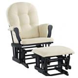 Angel Line Windsor Glider and Ottoman Black Finish and Beige Cushions.This Windsor Glider with Ottoman is the perfect product to complete your nursery. It has enclosed metal bearings for smooth gliding motion, generous seating room with padded arms, and pockets for extra storage. Appears to be new in retail packaging. Please attend the Preview to see the item for yourself. Retail $ 129.99