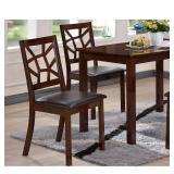 Contemporary dining chair MDF construction Trapezoid shape backrest slats Solid wood veneer with dark brown stain Black faux leather seat Material: Wood, foam, faux leather Finish: Dark brown Chair dimensions: 35.8 inches high x 18 inches wide x 17 inches deep Seat dimensions: 18.75 inches high x 18 inches wide x 16.5 inches deep