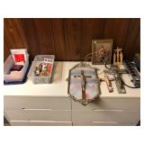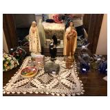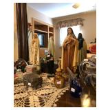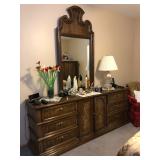 Master bedroom Full Size Bed W/ Tempur Pedic Mattress Topper, Sony TV, Side Table, Dresser W/Mirror, Armchair, Vanity Cabinet, Religious Statues, Murano Glass Fish and Paperweights, Vintage Leather Gloves, and more