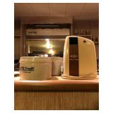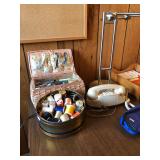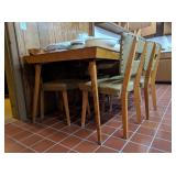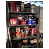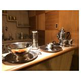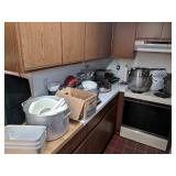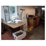 Basement Kitchen Supplies & Sundries, Collectible Tins, Blonde Mid Century Dining Set, Drying Rack, Large Cooking Pots, Universal Meat Grinder, Coffee & Tea Servers, Laundry Supplies, and more.