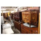 6 Piece Burl Mahogany VINTAGE Bedroom Set with Carved Swan Heads on Low Chest and Full Size Bed – auction estimate $700-$1500