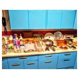 Kitchen Picnic Set In Wicker Carry Box, Antique Coronet China Set, Sterling Silver Base Wine Glasses, Godinger Silverware Set, Trudeau Thermoses, Flatware, 3 Sets of Dishes (Each Service for 12)