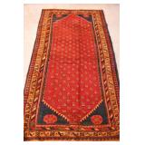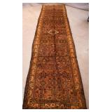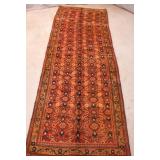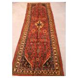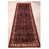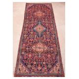Hand knotted vintage Persian Hamadan rug; 22-71598 - abrash - (some color bleed; 1 end is 2" wider than the other; cut/repair on end) - 3.5x9.7