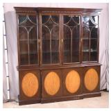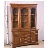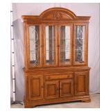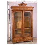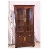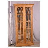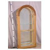 Pulaski arch top curio cabinet with etched glass; 662-1638 - side entry doors - curved top doors - mirrored back and bottom - includes 1 glass shelf (missing 3) - (veneer as-is on base; 1 top glass replaced with plexiglass) - 35x14x81