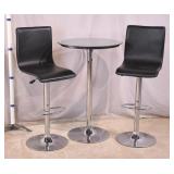 Black and chrome 3 piece pub set; 662-1646 - tall round table with pedestal base and beveled glass top - adjustable height stools with footrests - 26x26x40 table; 16x18x46; 31" seat height