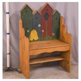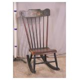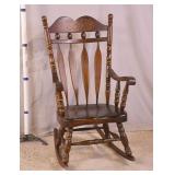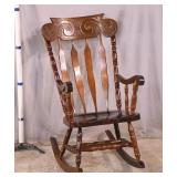 Pine rocking chair with decorated head rest; 253-121 - carved seat - turned legs and stretchers - (finish as-is) - 26.5x31.5x46