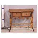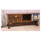 Carved console table with trestle base; 566-354 - drop down door with carving - door with painted knight scene - 65x14.5x26.5