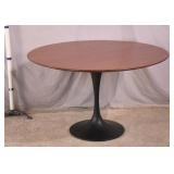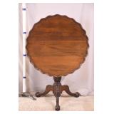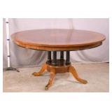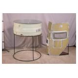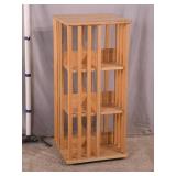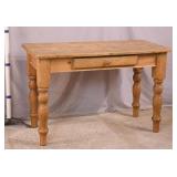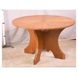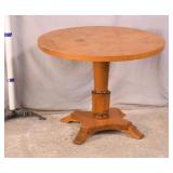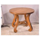 Round pine end table with turned stretcher; 253-192 - (1 leg is slightly darker) - 26x26x21.5