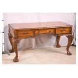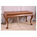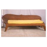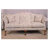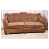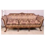 Carved frame sofa with paw feet and down cushions; 74-4945 - (fabric as-is; 1 back leg is broken off) - 85.5x32.5x32.5