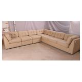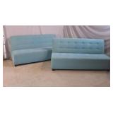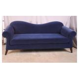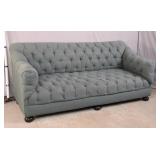 Large blue tufted sofa with bun feet; 68-636 - (fabric as-is: stained and small holes/tears) - 86x39x37