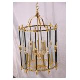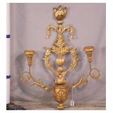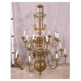 Large brass 2 tier 16 light chandelier; 55-4964 - decorative designs on arms, etc. - (some broken candle covers; missing 1 decoration on back) - 37x37x46.5