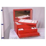 Large red jewelry box with lift top, multiple compartments and shelves; 913-149 - mirror under lid - 16.5x10.5x10