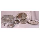 Group of 7 silver plate serving pieces; 765-350 - trays, bowls, plate, casserole stand, etc,