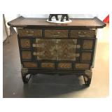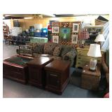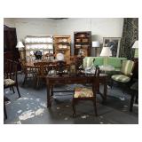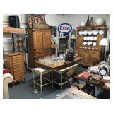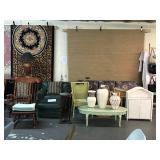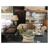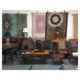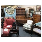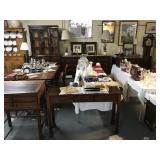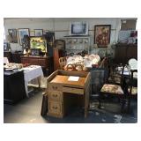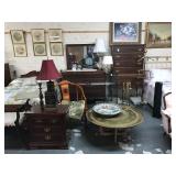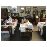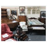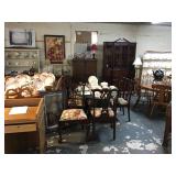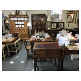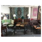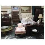 PARTIAL LISTING: Drexel Italian server; Primitives; painted Welsh cupboard; mahogany kidney shape desk; early oak plantation overseers desk; Queen Anne style table w/6 chairs; early wooden barn doors; black 4-door credenza; oak jewelry chest; carved oriental tables; oak table; set of 4 arrowback chairs; oak table w/carved dental molding; mahogany triple door bookcase w/satinwood pencil inlay; set of 6 rush bottom stools; leather club chair w/ottoman; Lexington cherry gentleman’s chest w/bracket feet; mahogany 4-doors w/fretwork breakfront w/broken arch; leaded glass window; walnut blind china cabinet; full size iron bed; twin size iron bed; set of 8 Chippendale style dining chairs; mahogany sofa table; wicker chairs; early leaded glass hanging light; oriental rugs; chests; Lamps; Tables; Sterling Silver; Oil paintings; Water colors; Prints; Clocks; China; Mirrors; Chairs; too many items to list. Pictures will be posted on Wednesday evening and Thursday morning! Rain is delaying deliveries so bare with us! And more pictures will be posted daily so keep checking back!!