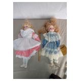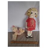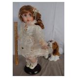 Description: Porcelain doll on stand w/dog biting her laces.