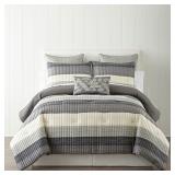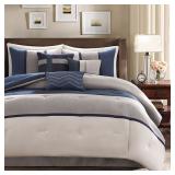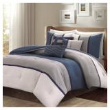 Madison Park Warner Bedding. Create a beautiful focus in your room with this bedding featuring a heather gray, navy blue and charcoal gray colorblock design. CalKing. Retail Packaging. MSRP $350.00. |