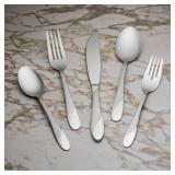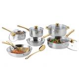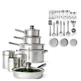 Cooks 52-PC. Stainless Steel Cookware Set. Enjoy outfitting your kitchen with our Cooks 52pc. Kitchen Set. This set has everything: cookware, food prep, food storage and flatware. The cookware features stainless steel bodies with aluminum bases for fast, even heating. Cooking with stainless steel also offers the healthiest cooking surface you can get. This set is also dishwasher safe and is oven safe to 350˚F. Retail Packaging. MSRP $160.00. |