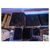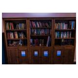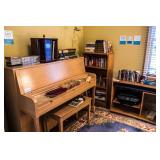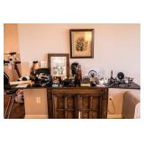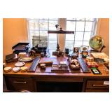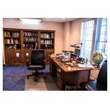 Beautiful Modular Executive Desk and Bookshelves, Clergymen and Liturgy Books, Office Supplies and Letter Openers, Settee Sofa, Upholstered Arm Chair, Wood and Glass Side Tables, Coffee Table with Vintage Board and Card Games, Holdiay Decor, Vintage Vinyl Records, Softcover and Hardcover Books, Curio Cabinet, Oak Dining Table and Chairs, Sony Stereo System Including Turn Table, Vintage Wood Dresser, Kitchen Items, Microwave, Vintage Percolator, Utilitarian Items and More.