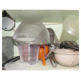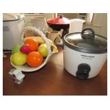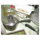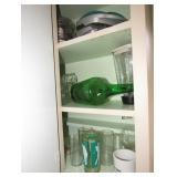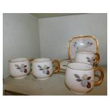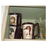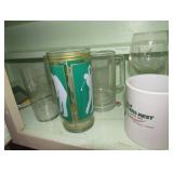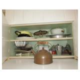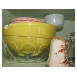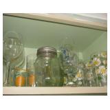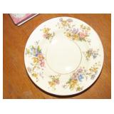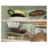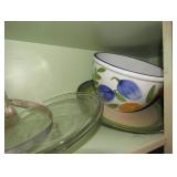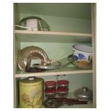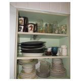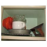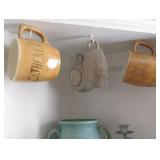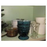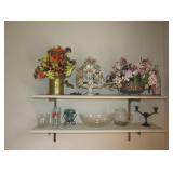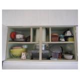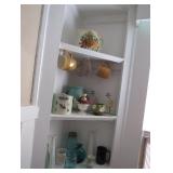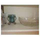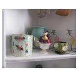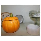 Shelf Lot China Cups & Saucers, Glass Bowl, Ceramic Pumpkin Holder, +