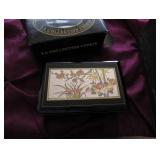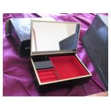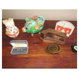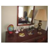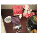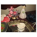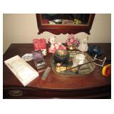 Contents of Dresser - Mirror Tray, Trinket Boxes, Porcelain Figurine, Ladies Gloves, & Bowl