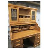 BEAUTIFUL LIGHT OAK ROLL TOP DESK WITH HUTCH ON TOP. HAS LOTS OF STORAGE AND IS IN EXCELLENT CONDITION. MEASURES 58" WIDE x 30" DEEP x 75" TALL. PLEASE SEE PHOTOS FOR DETAIL THERE IS A RESERVE ON THIS ITEM