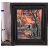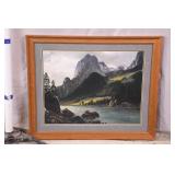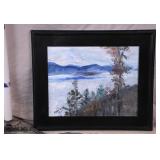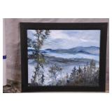 Framed original painting on canvas by Anna Sandhu Ray; 274-361 - mountain fog scene with black frame - (small dings in frame) - 26.5x22