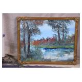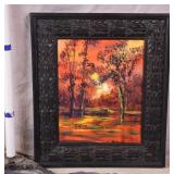 Framed original painting on canvas by Anna Sandhu Ray; 274-355 - sunset scene with ornate black frame - 24.5x28.5