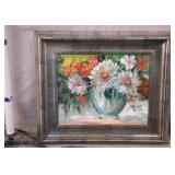 Framed original floral painting on canvas by Anna Sandhu Ray; 274-356 - distressed silver frame - 29x25
