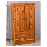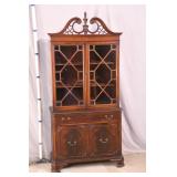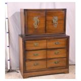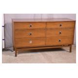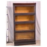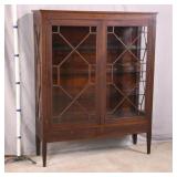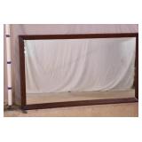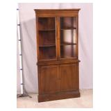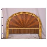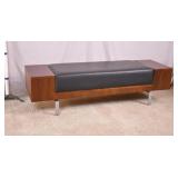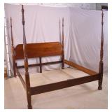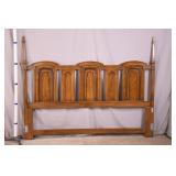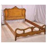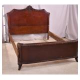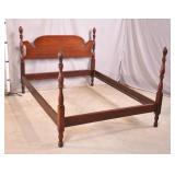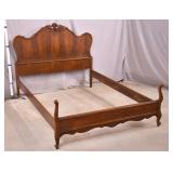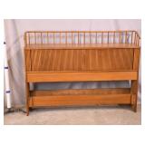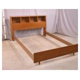Walnut mid-century full size bed with bookcase headboard; 737-2151 - metal rails - (missing sliding doors for headboard; 1 cracked brass toe cap) - 57x87.5x36; 53.5x76 inside rails