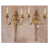 Pair of silver plate 2 light electric wall sconces; 103-992 - (missing globes and prisms; tarnished finish) - legend has it that these were originally in the White House and given to Mrs. Van Exam(SC congresswoman) during renovations - 15x12x9.5